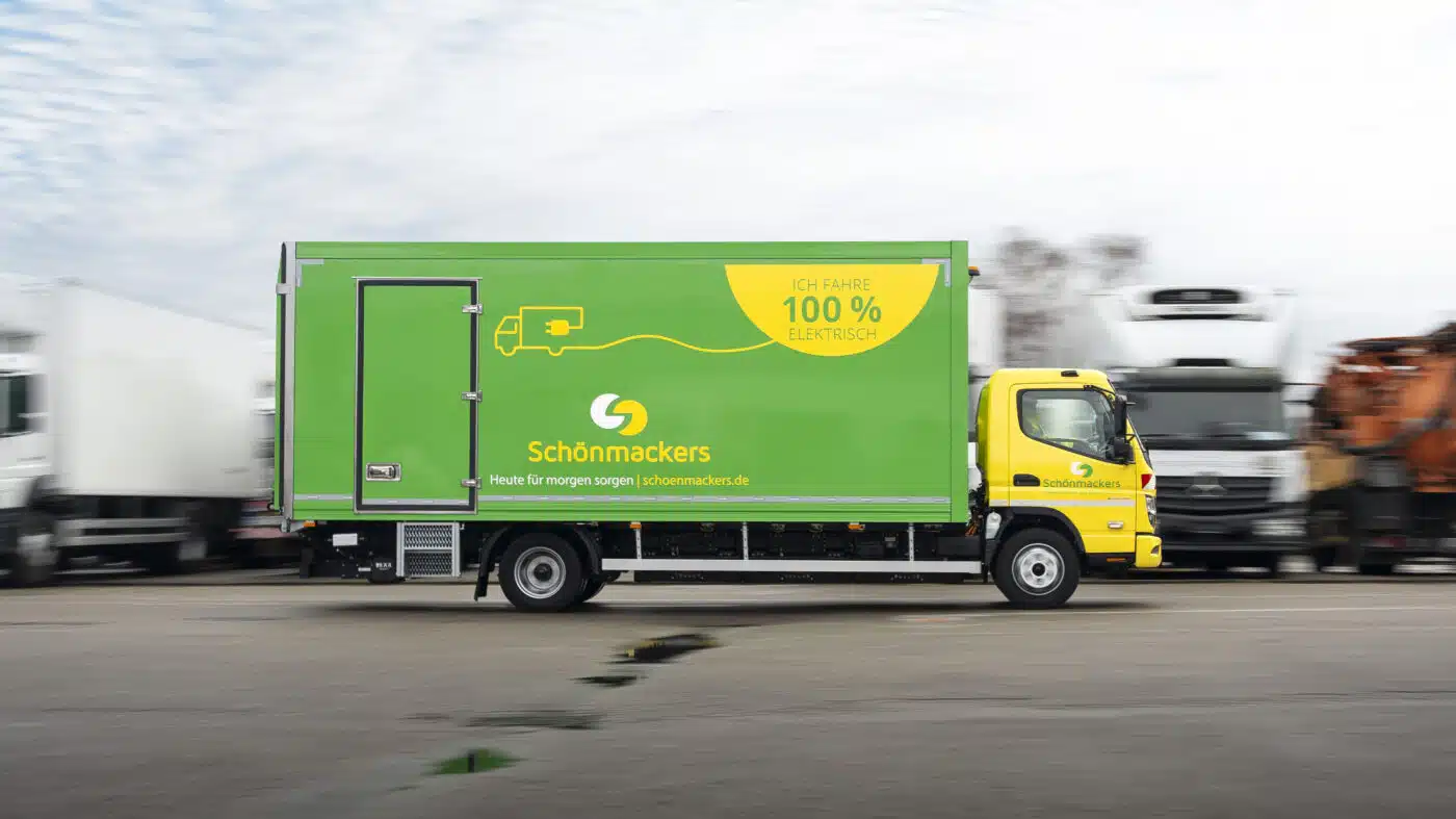 “Il primo passo per noi è l’apprendimento con il veicolo. È una piccola avventura a cui ci stiamo impegnando, ma sono abbastanza sicuro che, cosa ci siamo prefissati, cosa possiamo fare con l’eCanter – e poi guardiamo un po’ alla volta cosa succede ancora e fino a che punto possiamo ampliare il raggio dei viaggi”, descrive Michael Lohse il telone. Schönmackers ha previsto l’eCanter per il cosiddetto servizio di modifica dei serbatoi. L’autocarro elettrico trasporta contenitori per rifiuti vuoti con una capacità da 60 a 1.100 litri che vengono sostituiti, sostituiti o messi a disposizione dei clienti.